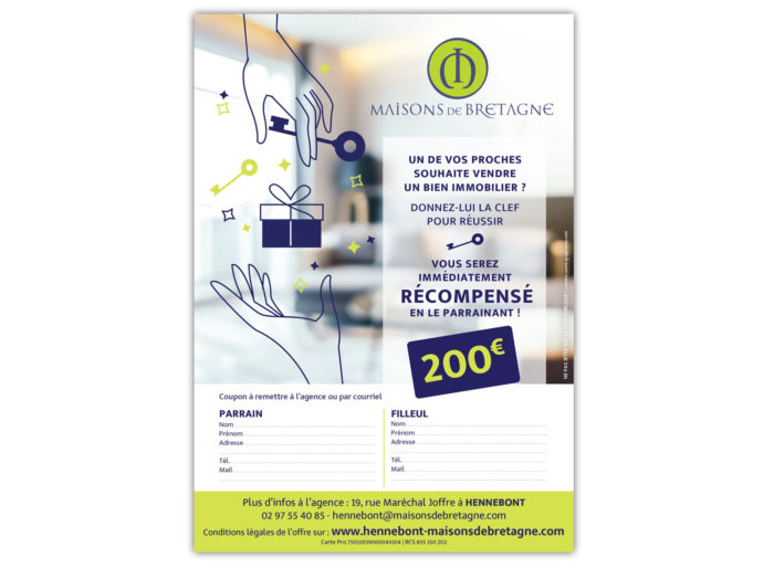 Création d’un flyer et du texte d’accroche pour l’agence immobilière « Maison de Bretagne » d’Hennebont . L’objectif était de mettre en valeur l’offre de parrainage, d’intégrer un coupon, en restant dans les couleurs et les codes graphiques qualitatifs de l’agence Offre de parrainage Maison de Bretagne Hennebont